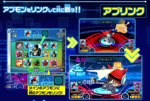 ระบบ “การเชื่อมต่อ Appmon หลักเพื่อความสามารถให้กับดิจิม่อน” เมื่อผู้เล่นเห็น Gatchmon ทำการเชื่อมต่อ (Linked up) กับดิจิมอนที่ชื่อ “Mailmon” ก็จะสามารถใช้ทักษะอย่าง “Mail Attack” ได้