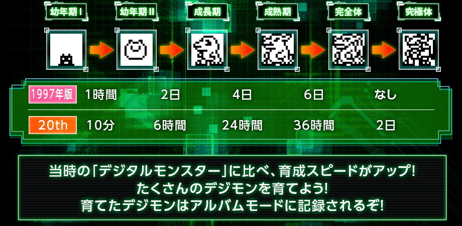 รุ่นนี้จะมีความพิเศษกว่ารุ่นดั้งเดิมก็คือ ใน Digital Monster Ver.20th จะเป็นการรวม V-Pet แทบจะทุกรุ่น ทุกตัวทุกแบบการพัฒนา ซึ่งลดระยะเวลาการอัพเกรดร่างลง และ สามารถพัฒนาได้ถึงร่างสุดยอด” โดยใช้เวลาเพียง 2 วันเท่านั้น (ซึ่งของเก่าใช้เวลานานนับเดือน)