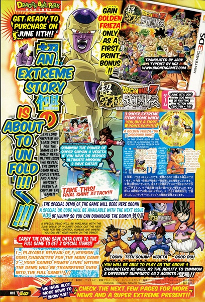 แต่ที่พิเศษสุดๆก็คือ ถ้าซื้อในล็อตแรกจะได้แถม Golden Frieza Dragon Ball Discross disc ซึ่งจะมีโค้ดให้ดาวน์โหลดเกม Dragon Ball Z: Butoden 2 เกมสมัยเครื่อง Super Famicom มาเล่นบน 3DS ได้ฟรีและการ์ดโกคูจาก Dragon Ball Z : Resurrection F สำหรับไปเล่นเกม Dragon Ball Heroes ที่ตู้อาร์เคด และถ้าใครที่มีเซฟเกม Dragon Ball Heroes: Ultimate Mission 2 จะได้เบจิต้าในร่างซุปเปอร์ไซย่า 4 ไปเล่นอีกด้วย