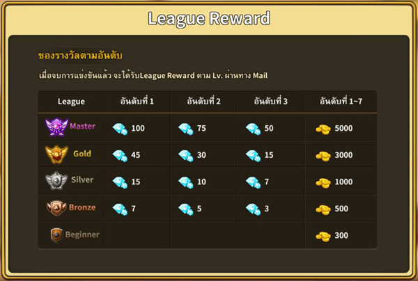 โดยของรางวัลที่จะได้รับหลังจากที่ League Battle จบในแต่ละสัปดาห์ และอยู่ในอันดับที่กำหนดก็จะได้รับของรางวัลตาม League ที่ผู้เล่นอยู่ในขณะนั้น