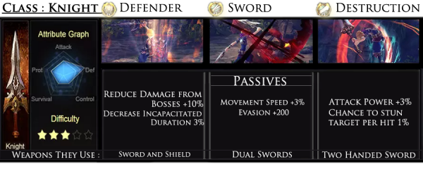 บลัดไนท์ ถือเป็นอาชีพพื้นฐานในเกมแนว MMORPG ที่มีความสามารถในเชิงดาบอันโดดเด่น ค่าพลังการป้องกันที่สูงกว่าสายอาชีพอื่นๆ ซึ่งสามารถเล่นแบบโซโล่ได้ และยังถูกกำหนดให้เป็น “ตัวแท็งค์” ให้กับการเล่นแบบปาร์ตี้ เป็นอาชีพที่มีความจำเป็นอย่างมาก เพราะต้องเข้ารับดาเมจแทนสมาชิกในปาร์ตี้ โดยแบ่งรูปแบบของ stances เอาไว้ 3 แบบ คือ Defender, Sword และ Destruction