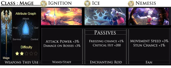 เมจ เป็นอาชีพที่สามารถสร้างความเสียหายให้แก่ศัตรูได้อย่างรุนแรง รูปแบบการโจมตีด้วยเวทยมนต์ที่เป็นแบบกำหนดเป้าหมายและแบบวงกว้าง ถือเป็น “ตัวทำดาเมจ” ที่สำคัญมากสำหรับการเล่นแบบปาร์ตี้ แต่ก็มีข้อจำกัดอยู่ที่ไม่ทนทานต่อการโจมตีจากศัตรู จึงต้องพึ่งพาการช่วยเหลือจากสมาชิกในปาร์ตี้อย่างมาก