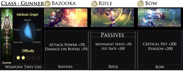 สไนเปอร์(หรือ Gunner) เป็นอาชีพในสาย DPS class (Damage Per Second) ที่มีความสามารถในการจัดการศัตรูได้อย่างรวดเร็ว มีส่วนในการช่วยเหลือสมาชิกในปาร์ตี้ คอยกำจัดจุดอ่อนที่ยากจะป้องกันให้กับทีมได้ ซึ่งเป็นจุดเด่นที่สุดและมีผู้เล่นจำนวนมากที่ชื่นชอบอาชีพสายนี้