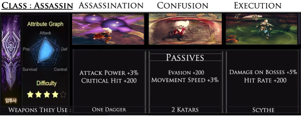 แอสซาซิน วอร์ริเออร์ เป็นอาชีพล่าสุด มีสกิลในการสังหารเป้าหมายและค่าการหลบหลีกที่สูงมากๆ อาชีพหนึ่งในเกมนี้ ซึ่งมีเพียงเผ่า Naru เท่านั้นที่สามารถเล่นเป็นอาชีพนี้ได้