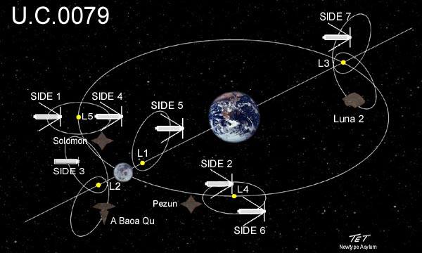 ภาพอาณาเขตของอาณานิคมอวกาศในยุค UC (ในภาค Mobile Suit Gundam Unicorn)