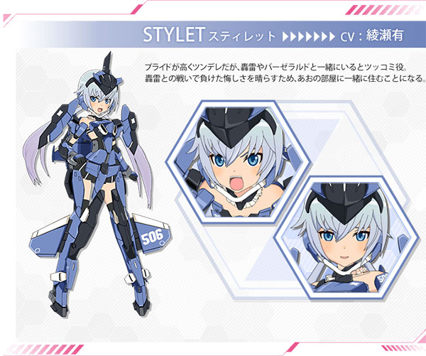 เฟรมอาร์มเกิร์ลที่เป็น “สินค้าตัวที่สอง” ของไลน์การผลิต มีต้นแบบมาจาก Stylet Renewal Ver. ในซีรีส์ Frame Arms 1/100 SA-16 ออกวางจำหน่ายครั้งแรกเมื่อเดือนตุลาคมในปี 2015