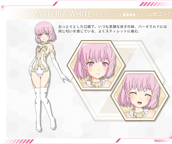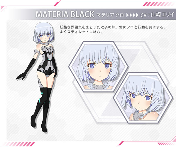 เฟรมอาร์มเกิร์ลที่เป็น “สินค้าตัวที่สาม” ของไลน์การผลิต ซึ่งมีอยู่สองสีด้วยกันคือ “Materia White”และ “Materia Black” เป็นหุ่นสินค้าที่ทำขึ้นมาเฉพาะไม่ได้มีต้นแบบมาจากหุ่นในซีรีส์ Frame Arms แต่อย่างใด โดย Materia Black ออกวางจำหน่ายครั้งแรกเมื่อเดือนมกราคมปี 2016 และ Materia White ออกวางจำหน่ายครั้งแรกเมื่อกลางเดือนกุมภาพันธ์ในปี 2016