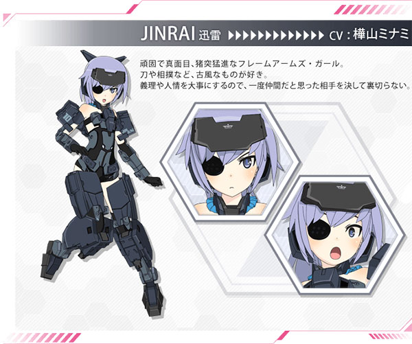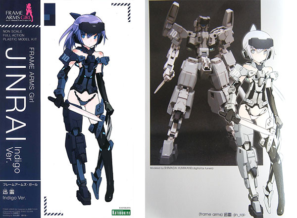เฟรมอาร์มเกิร์ลที่เป็น “สินค้าตัวที่หก” ของไลน์การผลิต ซึ่งมีชื่อรุ่นว่า Jinrai Indigo Ver. มีต้นแบบมาFrame Arms 1/100 Jinrai ออกวางจำหน่ายครั้งแรกเมื่อเดือนตุลาคมในปี 2016