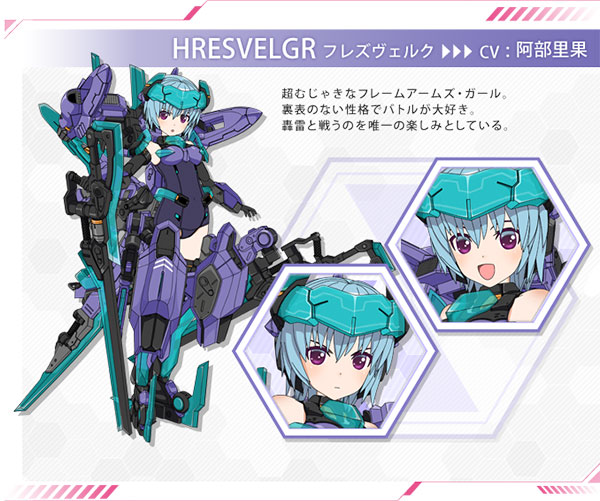 เฟรมอาร์มเกิร์ลที่เป็น “สินค้าตัวที่เจ็ด” ของไลน์การผลิต ซึ่งมีต้นแบบมาจาก1/100 Frame Arms NSG-X1 Hresvelgr ออกวางจำหน่ายครั้งแรกเมื่อเดือนมกราคมในปี 2017