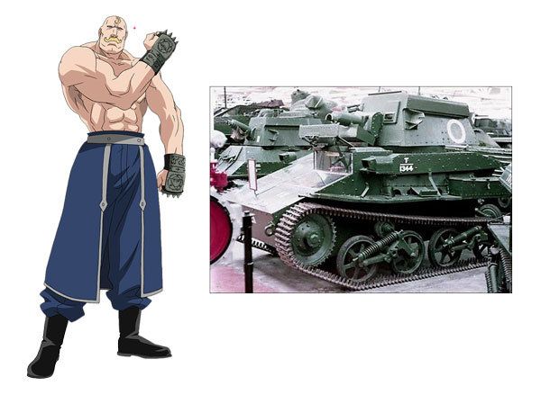 สำหรับชื่อของตัวละครหลายๆ คนในเรื่องแขนกลคนแปลธาตุ อาจารย์อาราคาว่าได้เอาชื่อของยานพาหนะในสมัยสงครามโลกครั้งที่สอง มาตั้งเป็นชื่อของตัวละครตัวนั้นๆ อย่าง