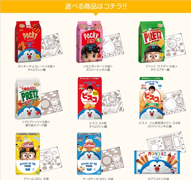 ซึ่งบริษัทกุลิโกะได้ออกแบบแพคเกจพิเศษยี่ห้อ Pocky , Pretz และ Collon เพื่อเป็นการต้อนรับเอนิเมชั่น Stand by me Doraemon การ์ตูนโดราเอม่อนที่ทำออกมาในรูปแบบ 3 มิติครั้งแรก