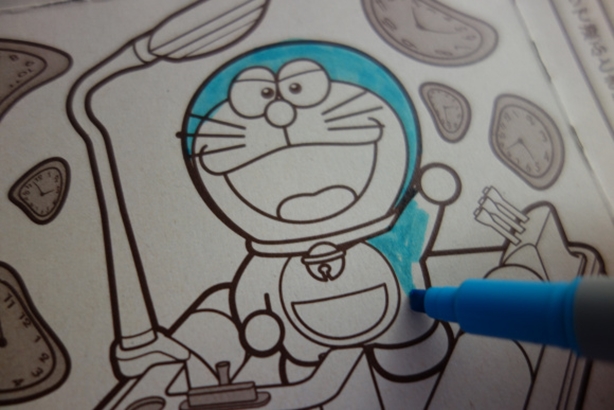 เมื่อเราแกะกล่องขนมออกมา ก็จะพบกับรูปโดราเอม่อนที่ยังไม่มีสี เราก็ลงมือระบายสีให้กับโดราเอม่อน ตรงนี้เราสามารถกำหนดสีของโดราเอม่อนได้ตามจินตนาการของเราเองได้เลย