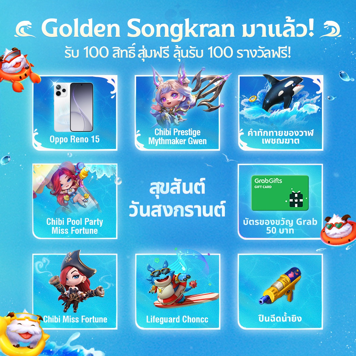 เมื่อผู้เล่นลงแข่งครบ 5 เกม จะได้รับ Chibi Songkran Lux ทันที พร้อมรับสิทธิ์สุ่มรางวัลจากการล็อกอินรายวัน ซึ่งสามารถใช้รับรางวัลในพูลที่ประกอบไปด้วย Prestige และ Mythic Chibis, Arena, เอฟเฟกต์โจมตี และอีกมากมาย