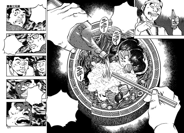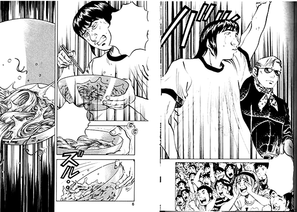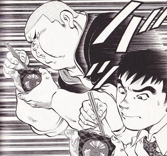 โจจิรับคำท้าทำให้บรรยากาศในร้านครึกครื้นทันที โจจิรับคำท้าก่อนจะให้โจจิจับตาดูเขาแข่งเพราะเขาจะ สอนวิชาการกินจุทางลัดให้โดยโจจิได้โชว์เทคนิค “ตะเกียบคู่” คืออีกมือคีบเส้นทานส่วนอีกข้างคีบค้างไว้เพื่อให้เส้นเย็นแล้วทานได้ทันทีจนสามารถจัดการชามแรกได้ชนิดที่เจ้าของร้านและลูกค้ารวมถึงมังทาโร่ไม่เชื่อสายตาตัวเอง แต่เมื่อเจ้าของไม่ได้ทำชามที่สองออกมาผลการแข่งเลยเป็นโมฆะ
