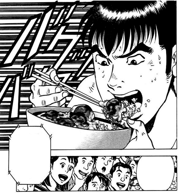 โอฮาระ มังทาโร่ หนุ่มออฟฟิศที่หมดเงินเดือนไปกับความเพลิดเพลินในรสชาติจากการเดินทางไปชิมของอร่อยทั่วญี่ปุ่นจนต้องทานบะหมี่ถ้วยเป็นประจำ วันหนึ่งขณะที่กลุ้มใจกับเงินที่เหลือน้อยนิดเขาก็ไปเห็นร้านอาหารแห่งหนึ่งซึ่งกำลังจัดแข่งกินข้าวหมูทอด เมื่อคนล่าสุดทำไม่สำเร็จมังทาโร่จึงขอลงแข่งแต่มีการปรับกติกาเล็กน้อย ทว่าด้วยความมือใหม่ทำให้เขาไม่สามารถเอาชนะไปได้ก่อนจะเสียเงินค่าข้าวซึ่งเป็นที่เหลือของเดือนนี้ไปอย่างน่าเสียดาย