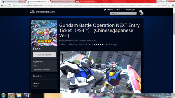 ตัวเกมเปิดให้ผู้ที่สนใจ สามารถสมัครเล่นเกมฟรี โหลดฟรี ได้ที่ช่องทาง https://store.playstation.com/#!/en-hk/games/addons/gundam-battle-operation-next-entry-ticket%ef%bc%88ps4%ef%bc%89/cid=JP0700-CUSA02630_00-ASIA000000000000