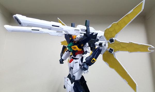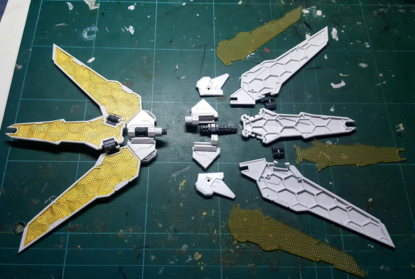 ส่วนปีก ยังคงการต่อเหมือนเดิม เพิ่มรายละเอียด และชิ้นตกแต่ง แต่ด้านในปีก กลับใช้สติ๊กเกอร์ฟลอยด์สะท้อนแสง แทนการใช้แผ่นพลาสติคเคลือบแสงในส่วนของการเพิ่มการสะท้อนเงาก่อนติดแผ่นเคลียร์สีเหลือง…จุดนี้แอบเซ็งนิดหน่อย เพราะสติ๊กเกอร์ค่อนข้างบาง และขาดง่ายไปนิด