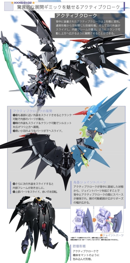 เสื้อคลุมแบบแอกทีฟที่เป็นปีกขนาดใหญ่ด้านหลัง สามารถใช้งานกับกลไกการเลื่อนที่เปลี่ยนโครงร่างได้หลากหลายแนวทาง