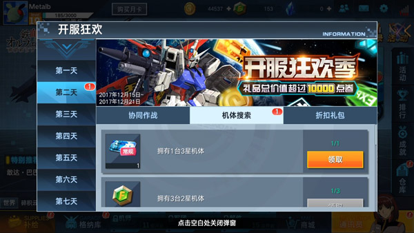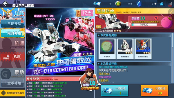 กาชาในเกมนี้จะมีทั้งกาชาสุ่มหุ่น นักบิน เงิน ทรัพยากร แต่ต้องเลเวลประมาณนึงก่อนนะครับถึงจะปลดล๊อกการสุ่มได้ โดยในช่วงแรกๆจะทำการสุ่มกาชาหุ่นเท่านั้น รางวัลดีี่สุดคือยูนิคอร์นกันดั้ม และ ZZ ระดับ 3 ดาว