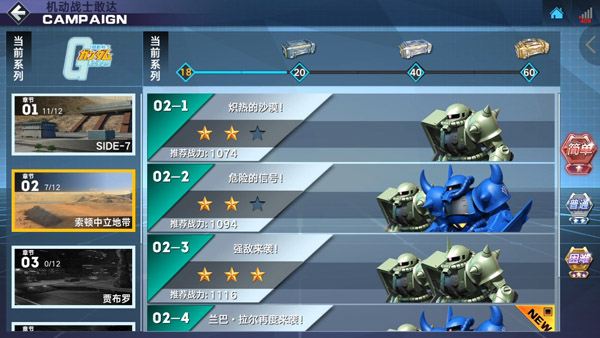 เป็นโหมดที่ปลดล๊อกได้เมื่อผู้เล่นเลเวล 4 โดยจะให้ผู้เล่นได้เข้าไปเล่นเนื้อเรื่อง พร้อมชมคัทซีนสวยๆ เอาไว้ฟาร์มไอเทม EXP และเงินราวัล รวมไปถึงการปลดล๊อกหุ่นใหม่ๆ โดยในช่วงเบต้าเทสท์ จะมีเนื้อเรื่อง กันดั้มภาคแรก , กันดั้มวิง และ SEED นอกจากนี้ยังมีโหมดดวลกับบอส หรือรวมทีมยำบอส ได้อีกด้วย