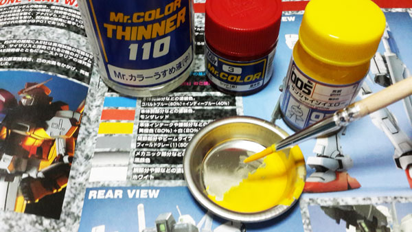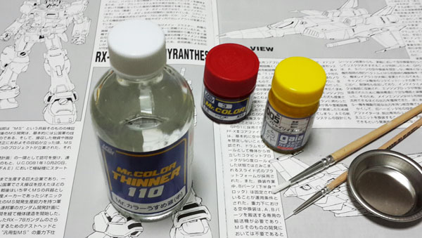 การทำสีกับงานพลาสติก จำเป็นจะต้องรู้จักคุณสมบัติของสีอคิลิคก่อน สีประเภทนี้จะใช้ “ทินเนอร์” เป็นตัวทำละลาย ซึ่งสามาถหาซื้อทินเนอร์ได้ทั้งของดีมียี่ห้อตามร้านกันพลา และแบบถังปี๊บเล็กตามร้านวัสดุก่อสร้าง ซึ่งราคาก็แตกต่างกันมากพอสมควร อุปกรณ์อื่นๆที่จำเป็นคือ ถาดผสมสี และพูกัน รวมไปถึงแอร์บรัชด้วย