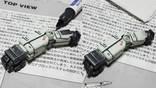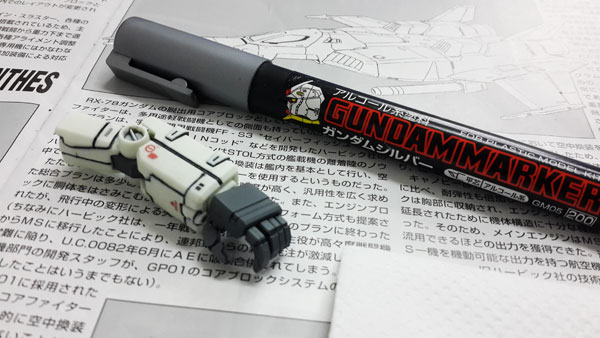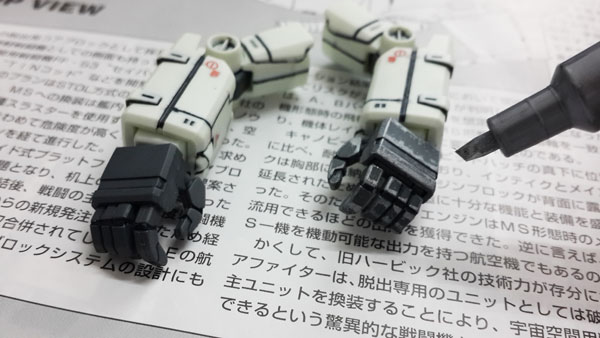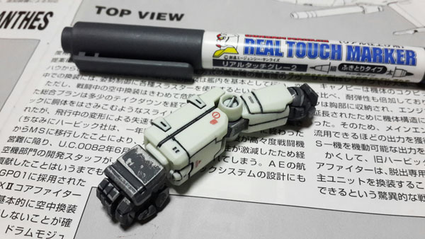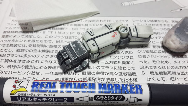 สำหรับคนที่อยากให้กันดั้มดูสมบุกสมบัน เหมือนผ่านการใช้งานจริงในสงคราม สามารถเติมรายละเอียดให้ชุดเกราะรอบๆตัวโดยใช้ปากกาประเภท Gundam Marker Real Touchซึ่งปากกาประเภทนี้จะให้สีที่มีความเหลวและเจือจางกว่าสีจากปากกาชนิดอื่น เราสามารถนำมาใช้ไล่สี “เฉดดิ้ง” ที่ให้อารมณ์ใกล้เคียงกับการทำแอร์บรัชได้