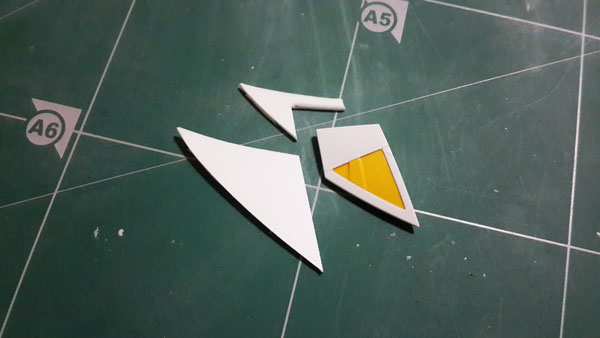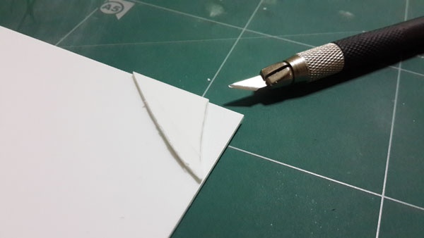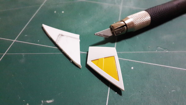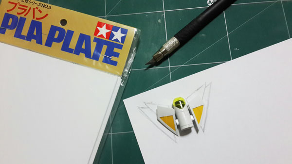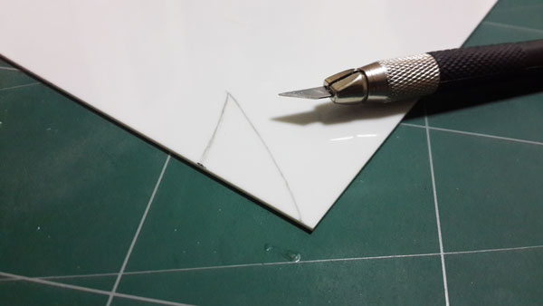 สำหรับงานเสริมปีก ผมเลือกใช้ Plaplate ที่มีความหนามากที่สุด ทำการวาดลายที่ออกแบบไว้ด้วยดินสอ แล้วค่อยใช้ มีดอาร์ตไนท์กรีดตามรอยเบาๆซัก 2-3 ที่ พอได้แนวร่องแล้วค่อยลงน้ำหนักซ้ำๆเพื่อตัดพลาสติกให้ขาด