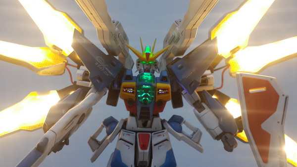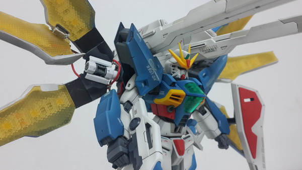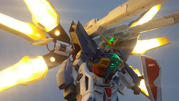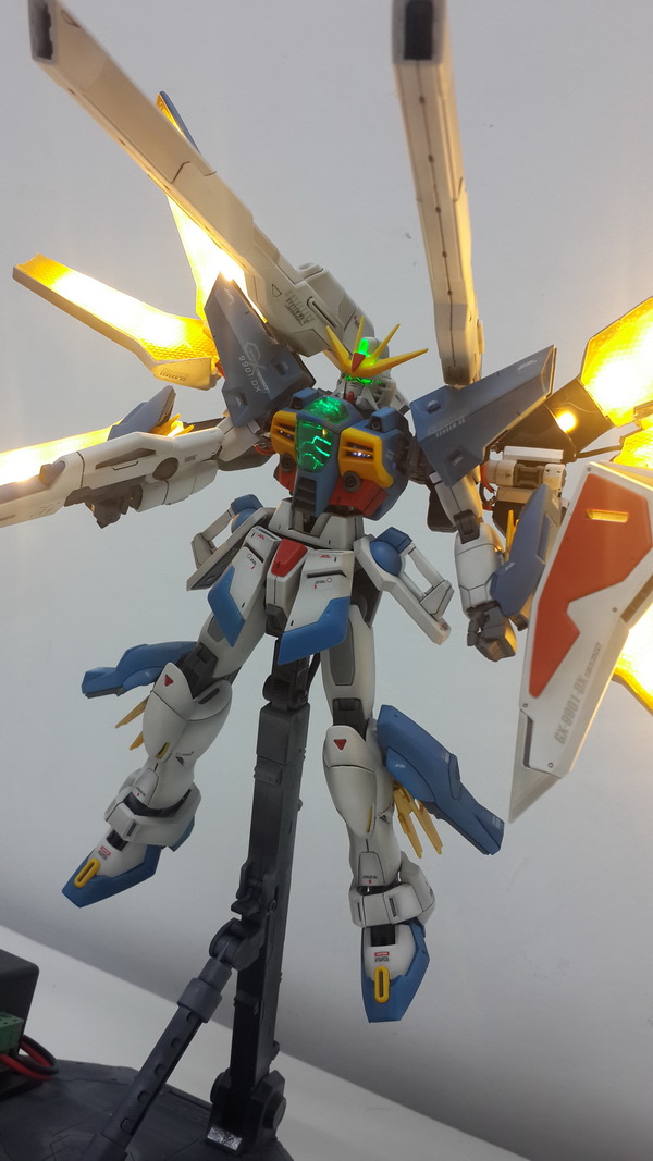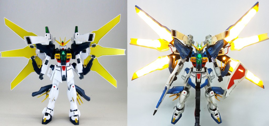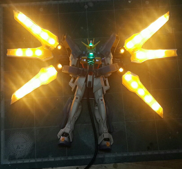 การเดินสายไฟในตัวหุ่นนั้น จำเป็นต้องใช้หุ่นที่มีขนาดใหญ่พอสมควร ในการสร้างพื้นที่การเดินสายไฟในตัวหุ่น จึงไม่เหมาะที่จะทำกับหุ่นขนาดเล็ก 1/144 หรือรุ่น HG และ RG ซึ่งการต่อหลอดไฟ 1 ดวงจำเป็นต้องใช้สายไฟ 2 เส้นคือขั้วบวกและขั่วลบ ซึ่ง MG Double X ตัวนี้จะทำการติดไฟทั้งหมด 2 ชนิดคือ LED ดวงเล็กบริเวณหัวและอก 4 ดวง และไฟแบบ LED Line บริเวณปีกอีก 6 เส้น รวมแล้วต้องเดินสายไฟทั้งหมด 20 เส้น (เยอะมาก) โดยไฟทุกดวงจะปรับความต้านทานให้สามารถใช้ไฟจากหม้อแปลง 12 โวลต์เท่ากันหมด