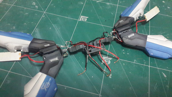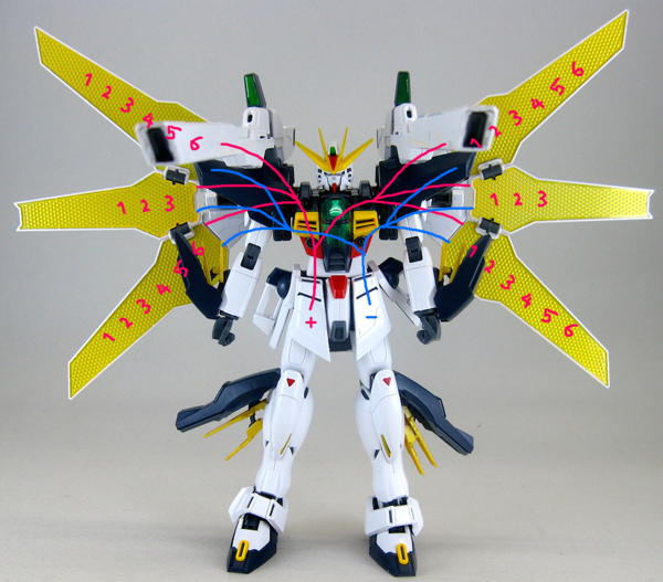 วางโครงสร้างเดินสายไฟจากปีกข้างละ 6 เส้นมารวมเข้าด้วยกันก่อน โดยแยกขั่วบวกและลบ ทำให้เหลือสายไฟข้างละ 2 เส้น แล้วนำทั้ง 2 ข้างมารวมกันจนเหลือสายไฟจากปีกทั้งหมดเพียงแค่ 2 เส้นแล้วนำมาโยงรวมกับไฟส่วนหัวและอกตรงส่วนท้องเพื่อส่งสายไฟออกไปยังหม้อแปลงที่กระโปรงหลังของตัวหุ่น