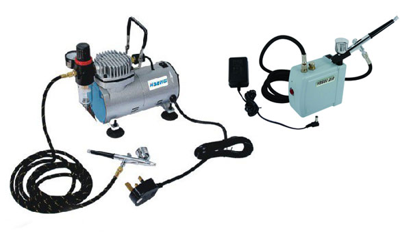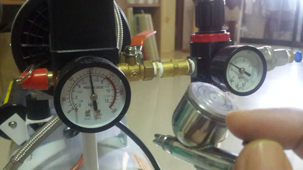 การพ่นสี จำเป็นต้องใช้แรงดันลมในการเป่าสีออกมา ซึ่งอุปกร์ปล่อยลมก็มีให้เลือกใช้มากมาย เช่น ลมอัดกระป๋องราคาหลักร้อยแต่ใช้ไม่นานลมก็หมดอันนี้ไม่แนะนำให้ใช้เพราะสิ้นเปลืองมาก สำหรับมือใหม่ที่งบน้อยแนะนำให้ใช้เครื่องปั้มลมแบบ Mini Compressor ราคาเริ่มต้นประมาณพันบาทเป็นต้นไป แรงดันลมอยู่ที่ประมาณ 1 Bar ซึ่งก็เพียงพอที่จะใช้พ่นไล่เฉดสีได้เหมือนกัน แต่สีที่พ่นออกมาจะค่อนข้างเบาและมีเส้นเล็ก เวลาพ่นเปลี่ยนสีชิ้นงานทั้งชิ้นอาจจะต้องพ่นย้ำๆหลายๆรอบหน่อย และเครื่องแบบนี้จะเดินเครื่องปั้มลมตลอดเวลา อาจส่งเสียงรบกวนคนข้างบ้านได้