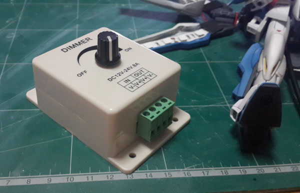 ชิ้นงานที่ต่อไฟเรียบร้อยแล้วอาจจะให้แสงสว่างที่มากเกิน ยิ่งเป็นไฟแบบ LED จะให้แสงสว่างที่แสบตามาก ซึ่งเราสามารถลดความสว่างของหลอดไฟได้ด้วยการติดตัว ดิมเมอร์ ก่อนจ่ายไฟเข้าตัวหุ่น จะทำให้สามารถปรับความสว่างได้ตามต้องการ แต่ก่อนเลือกซื้อมาใช้ก็ควรตรวจดูแรงดันไฟที่ดิมเมอร์ให้ตรงกับหม้อแปลงที่ใช้ด้วย อย่างตัวที่ผมเลือกใช้จะใช้ได้กับไฟ 12v – 24v
