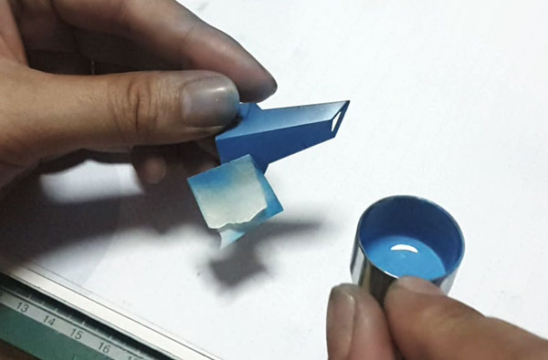 งานพ่นสีอคิลิค เวลาตัดเส้นควรเลือกชนิดของหมึกให้ดี เพราะถ้าใช้ปากาตัดเส้นสูตรทินเนอร์ แล้วใช้ทินเนอร์ลบรอยเส้นเลอะ จะทำให้สีที่พ่นมาพังได้ จึงควรเลือกใช้ Enamel : Panel Line สูตรน้ำมันของทามิย่าปลายหัวพู่กัน จุ่มหมึกซับทิชชูให้พอหมาดแล้ว แตะที่เส้นลวดลายต่างๆ น้ำหมึกจะไหลปรืดปราดไปตามร่องอย่างรวดเร็ว ส่วนรอยที่เลอะออกมาก็ใช้น้ำมันเบอร์ X-20 ชุบคัทตั้นบัทเช็ดออกได้ ซึ่งสีสูตรน้ำมันจะไม่ทำละลายสีอคลิลิคที่เราได้พ่นไว้ก่อนหน้า