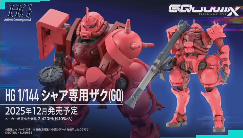 Bandai Spirits ได้ประกาศเปิดตัวกันพลาโมบิลสูทในตำนานในสีเฉพาะตัวของ “ชาร์ อัซนาเบิ้ล” (Char Aznable) อย่าง HG 1/144 Zaku Char’s Custom ซึ่งเป็นส่วนหนึ่งของสินค้าจากซีรีส์ใหม่ Mobile Suit Gundam GQuuuuuuX โดยมีกำหนดวางจำหน่ายในช่วงต้นเดือนธันวาคม ปี 2025 พร้อมให้แฟนๆ ได้เป็นเจ้าของหุ่นรบสีแดงแรงสามเท่าตัวนี้