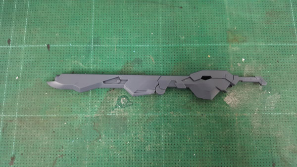 ส่วนที่เป็นอาวุธของตัวนี้มีเพียงชิ้นเดียวเท่านั้นคือ ดาบที่พับเป็นปืนได้ ขั้นตอนการประกอบจะเป็นชิ้นประกบซ้าย-ขวา แยกเป็น 2 ส่วนคือส่วนที่เป็นปลายดาบและส่วนที่เป็นด้ามจับ 2 ส่วนนี้จะเชื่อติดกันตรงข้อต่อส่วนกลาง ที่เป็นจุดหมุน แต่ไม่ได้มีชิ้นส่วนเอาไว้ล๊อค แค่ประกบสองชิ้นเอาไว้ด้วยกันก็อยู่แล้ว