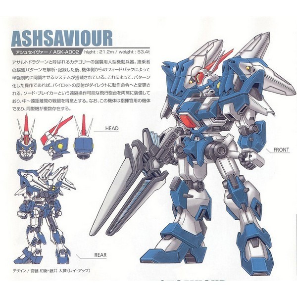 ASK -AD02 Ashsaviourได้รับการออกแบบต่อยอดจาก Ashclief จากเกม Super Robot Wars 64 เป็นยูนิตหุ่นที่มีความสมดุลระดับสูง