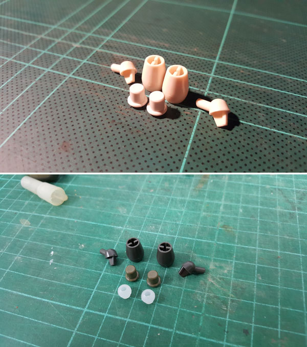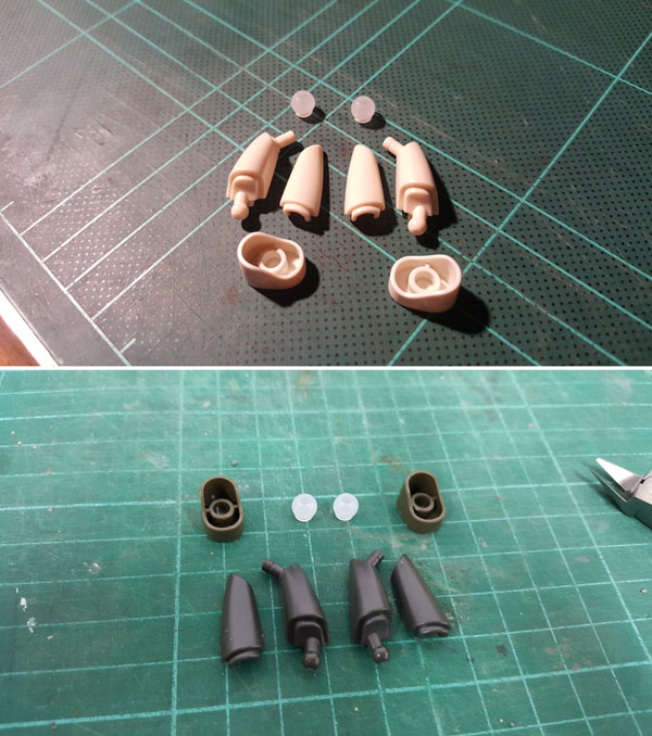 ชิ้นส่วนขาทั้ง 2 ข้าง มีทั้งหมด 8 ชิ้นรวมPCแล้ว วิธีประกอบก็แค่ นำมาประกบติดกันและใส่ชิ้นของเท้าเข้าไป ก็เป็นอันเรียบร้อย