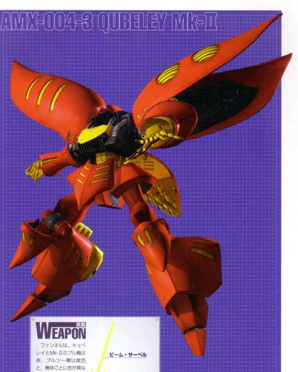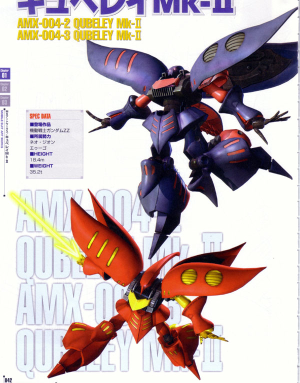 หุ่นประกอบ Gunpla ตัวนี้ เป็นโมบิลสูทที่มีต้นแบบจาก AMX-004 Qubeley อยู่ในภาค Mobile Suit Gundam ZZ โดย Qubeley เป็นหนึ่งในหุ่นรบที่รอดจากสงครามกรีปส์มาได้ แต่สุดท้ายก็ถูกทำลายในการต่อสู้กับ ดับเบิล เซต้า กันดั้ม ของจูโด้ ต่อมากองทัพ นีโอ ซีอ้อน ได้พัฒนา AMX-004-2 Qubeley MK-II เครื่องสีม่วงเข้มขึ้นมา เพื่อเตรียมผลิตออกเป็นจำนวนมาก โดยมีเด็กหญิง Elpeo Ple (เอลพี เพิล) เป็นผู้ขับ ซึ่งตัวหุ่น Qubeley Mk-II ตัวนี้ สามารถปรับทิศทางของ Beam Saber ได้และยังเพิ่มจำนวนของ Funnel ขึ้นเป็น 12 ยูนิตนั่นเอง