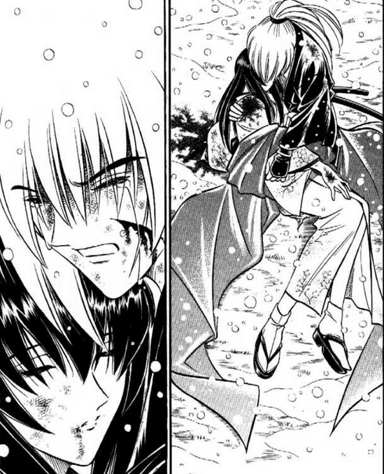 โทโมเอะ และ เคนชิน ก็ถูกไล่ล่าโดยพวกนักรบดำจนได้ ด้วยจำนวนคน และฝีมือที่ต่างกัน ทำให้เคนชินสุญเสียประสาทสัมผัสไปชั่วระยะเวลาหนึ่ง จนในที่สุด ด้วยความรักของโทโมเอะที่ตั้งใจจะเข้าไปจัดการกับศัตรู ก็ถูกเคนชินสังหารโดยไม่ได้ตั้งใจ และแผลที่สอง ก็เกิดขึ้นในตอนนั้น พร้อมกับผู้ที่เห็นเหตุการณ์จากที่ไกลๆ “ยูกิชิโร่ เอนิชิ” น้องชายของโทโมเอะนั่นเอง เอนิชิจากไปพร้อมความแค้นสุมอก และรอวันที่จะกลับมาเอาคืนเคนชินในอนาคต…