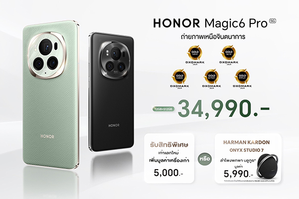 สัมผัสประสบการณ์การถ่ายภาพเหนือจินตนาการด้วยเทคโนโลยี AI สุดอัจฉริยะ กับสมาร์ตโฟนเรือธง HONOR Magic6 Pro มีทั้งหมด 2 สี ได้แก่ สีเขียว (Epi Green) และ สีดำ (Black) สามารถเป็นเจ้าของได้ในราคา 34,990 บาท เริ่มจำหน่ายวันแรกตั้งแต่วันที่ 5 เมษายน 2567 เป็นต้นไป และพิเศษสุด Early Bird Promotion ระหว่างวันที่ 5 – 21 เมษายน 2567 เลือกรับ Trade Up สูงสุด 5,000 บาท* หรือ รับฟรี ลำโพง HARMAN KARDON ONYX STUDIO 7 มูลค่า 5,990 บาท* สามารถซื้อได้ที่ HONOR Experience Store ทุกสาขา และร้านตัวแทนจำหน่ายทั่วประเทศ