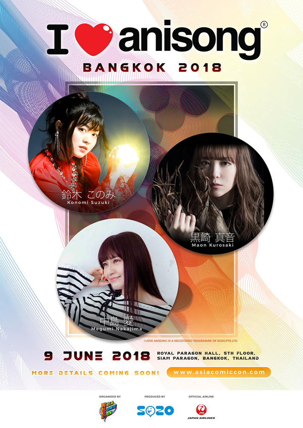 เมื่อกล่าวถึงงาน AFA – Anime Festival Asia แล้วนั้นก็ต้องนึกถึงคอนเสิร์ตเพลงอนิเมะ I love anisong ไปด้วย จนกลายเป็นเอกลักษณ์ของงานควบคู่กันไป ซึ่งงาน AFA ก็ได้มาจัดงานที่ประเทศไทยตั้งแต่ปี 2015 เป็นต้นมา จนในปี 2018 นี้แม้ AFA จะไม่ได้มาจัดงานที่ไทย แต่ก็ได้นำคอนเสิร์ต I love anisong มาจัดอยู่ภายในงาน Asia Comic Con ที่กำลังจะถึงนี้อีกด้วย ซึ่งศิลปินที่มาในครั้งนี้มีด้วยกัน 3 คนด้วยกัน เป็นใครกันบ้าง ไปทำความรู้จักกันเลย