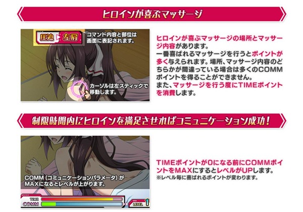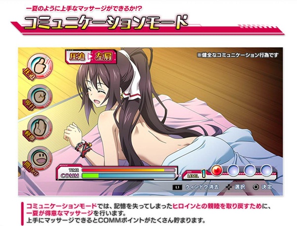แต่ความสนุกของเกมส์ที่หนุ่มๆรอคอยมันคือส่วนของ “Communication Mode” หรือเรียกว่าโหมดความสัมพันธ์ก็ได้ ที่จะเปิดโอกาสให้ทำความสนิทสนมกับสาวๆให้ลึกซึ้งและแน่นแฟ้นยิ่งกว่าเดิม เริ่มจากพูดคุยแล้วเสนอตัวนวดให้สาวๆ โดยการนวดนั้นขึ้นอยู่กับเทคนิคการนวดของผู้เล่นเอง หากเทคนิคดี จะได้รับค่า Brave Heart มากขึ้น แต่หากทำแย่ก็จะถูกหักค่า Brave Heart เช่นเดียวกัน