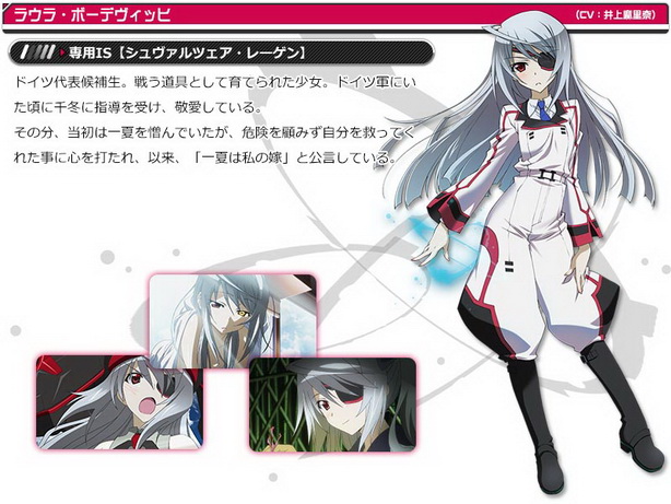 เป็นตัวแทนนักเรียนนายร้อยจาก ประเทศเยอรมัน มียศร้อยตรีของหน่วยกระต่ายดำ มีจุดเด่นที่ผมยาวสีเงินและมีสีตา 2สี โดยข้างขวาเป็นสีดำ และข้างซ้ายที่ปิดตาเอาไว้เป็นสีทอง เป็นเด็กสาวที่ตัวเล็กที่สุดในกลุ่ม และยังเป็นเด็กที่อยู่ภายใต้การดูแลเป็นพิเศษ จากจิฟูยุ พี่สาวของอิจิกะ ถนัดในการต่อสู้ประชิดตัวของทหาร ในอดีตนั้น… เธอเป็นเด็กที่ถูกฝึกมาเพื่อที่ให้กลายเป็นทหารในสมรภูมิ แต่ด้วยจากสมถภาพทางร่างกายที่ตนมีนั้นไม่เพียงพอที่จะตอบสนองต่อบังคับ IS ได้ เธอจึงไม่เป็นที่ถูกยอมรับ แต่เมื่อได้มาเจอกับจิฟูยุที่ได้มาประจำในศูนย์ฝึกที่เยอรมัน… เธอหลงใหลในความแข็งแกร่งนั้นของจิฟูยุ นั่นเองที่ทำให้เธอได้ตามมาเรียนต่อที่ญี่ปุ่น ตอนแรกเธอก็ไมได้อยากจะซี้กับเจ้าเกย์นี่เท่าไหร่หรอก แต่ไปๆ มาๆ เธอกับแสดงความรักแบบเด็กๆ โดยให้อิจิกะเป็นเจ้าสาว (!?) แถมนิสัยบางอย่างยังใสซื่อสุดมุ้งมิ้งน่าดูชมเลยทีเดียว (เป็นนางแรกที่ชิงตัดหน้า Frist Kiss กับอิจิกะท่ามกลางบรรดาสาวๆ ในห้อง) บทบาทนางเอกของเธอคนนี้ในซีซั่นแรกนับว่ามาแรงแซงทุกนางอย่างมากเลยทีเดียวเชียว