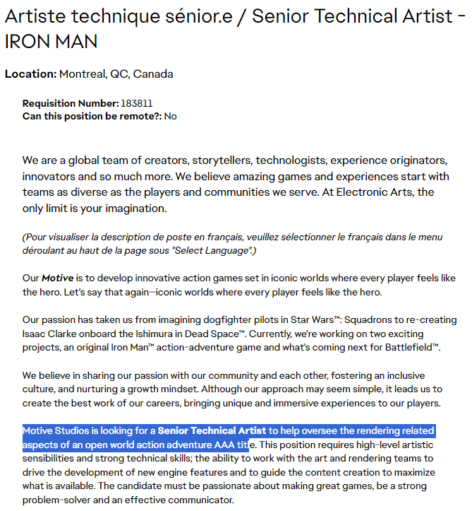 ตามที่เปิดเผยโดยเว็บไซต์เกม Geekinout เผยเอกสารการโพสต์รับสมัครงานสำหรับ “ศิลปินเทคนิคอาวุโส – IRONMAN“ ของ EA ที่ได้แสดงรายการตำแหน่งงานว่างที่สตูดิโอในมอนทรีออล