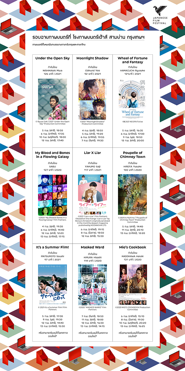 เจแปนฟาวน์เดชั่น กรุงเทพฯ, โรงภาพยนตร์เฮ้าส์ สามย่าน และ บริษัท เอส เอฟ คอร์ปอเรชั่น จำกัด (มหาชน) ภูมิใจนำเสนอเทศกาลภาพยนตร์ญี่ปุ่น 2565 (JFF2022) ที่จะจัดการฉายภาพยนตร์ในโรงขึ้นที่ กรุงเทพฯ และ เชียงใหม่ โดยได้รับการสนับสนุนจากสถานเอกอัครราชทูตญี่ปุ่นประจำประเทศไทย และ สมาคมญี่ปุ่นในประเทศไทย ในปีนี้เทศกาลภาพยนตร์ญี่ปุ่น 2565 จะทำการฉายภาพยนตร์หลากหลายอรรถรสทั้งหมด 12 เรื่อง โดยมีภาพยนตร์ 9 เรื่องฉายที่กรุงเทพฯ และ 7 เรื่องที่จะฉายที่เชียงใหม่ (ภาพยนตร์ 4 เรื่องที่ฉายที่เชียงใหม่จะเป็นเรื่องเดียวกับที่ฉายที่กรุงเทพฯ)