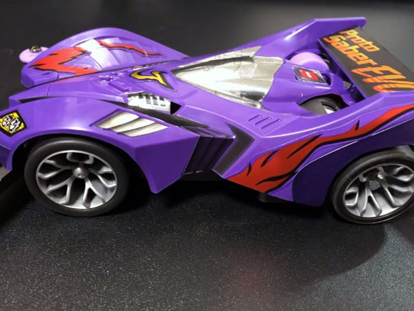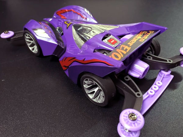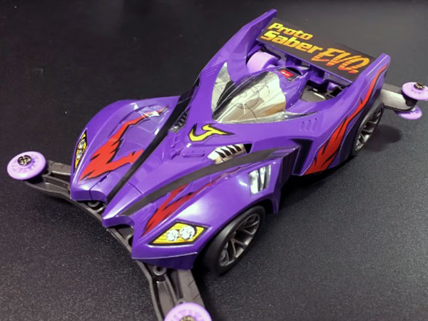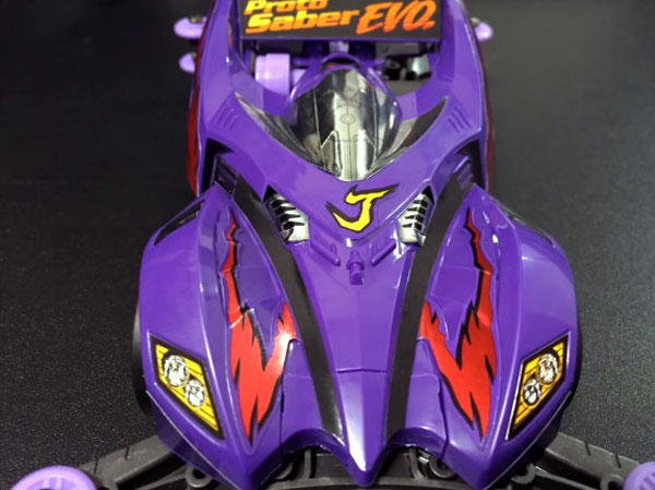 รถประกอบ ทามิย่า คันนี้ เป็นรถของ J (เจ) หนึ่งในสมาชิกของทีม TRF Victorys ซึ่ง Proto-Saber Evolution คันนี้ ได้รับการวิวัฒนาการมาพร้อม ๆ กับ Spin Cobra รถของเจ้าหนูไฮโซ Tokichi Mikuni เพื่อจะนำมาแข่งขันกับกลุ่มของโอกามิ แต่เนื่องจากด้วยเวลาที่มีจำกัด เจจึงเร่งพัฒนา Spin Cobra ให้เสร็จสมบูรณ์ก่อน แล้วถึงมาพัฒนารถของตนเอง ซึ่งทั้ง 2 คัน ได้ฝังชิปเข้าไปในตัวรถเพิ่มกลไกในอัตราเร่งให้มากขึ้น Proto-Saber Evo คันนี้ สามารถสร้างกระแสลมให้เกิดรูปทรงเป็นรูปปลาโลมาได้นั้นเอง…