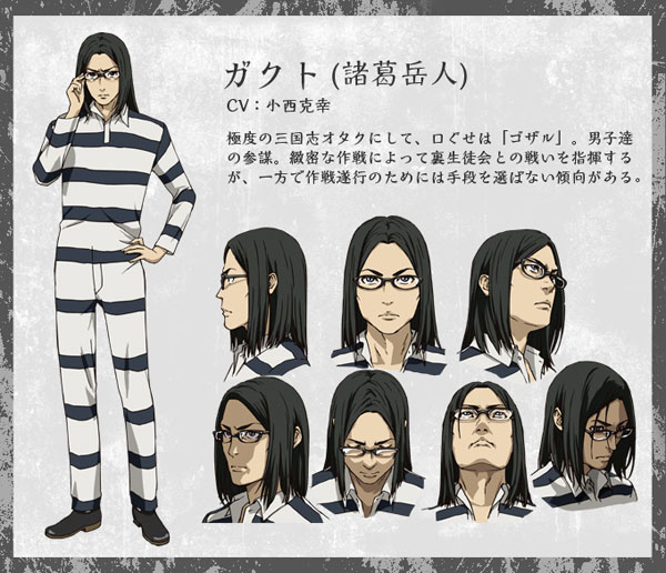 หนุ่มแว่นผมยาวมาเซอร์ ผู้หมกมุ่นอยู่กับสามก๊ก จนมีวิธีการพูดแบบโบราณ พูดเหมือนจะเป็นพวกบุรุษชายผู้เคร่งขรึม แต่เปล่าเล้ย!! ก็หื่นพอๆ กันทั้งนั้น อีกทั้งเขายังเป็นจอมวางแผน ที่ชอบทำหน้าเหียก พร้อมยัดเยียดตัวเองเข้าไปหา -ีน บรรดาผู้คุมสาว เพื่อที่จะบรรลุเป้าหมายของตัวเองได้เสมอ จึงไม่เเปลกใจเลยที่เขาจะเป็นแนวร่วมผู้สนับสนุนคนสำคัญในการการแหกคุกของคิโยชิ