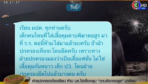 “เรียน ผปค. ทุกท่านครับ เด็กคนไหนที่ใส่เสื้อคลุมดาบพิฆาตอสูร มาที่ ร.ร. ตอนนี้ห้ามใส่มาแล้วนะครับ ถ้าฝ่ายปกครองเห็นจะโดนยึดครับ เพราะทางฝ่ายปกครองมองว่าเป็นเสื้อแฟชั่น ไม่ใช่เสื้อคลุมกันหนาว เด็ก ป.3 โดนฝ่ายปกครองยึดไปแล้วบางคนครับ”