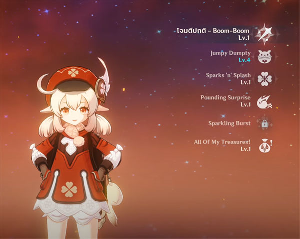 Sparkling Burst เมื่อคลีโจมตีติดคริ เพื่อๆในทีมจะได้ค่า Elemental 2 หน่วย