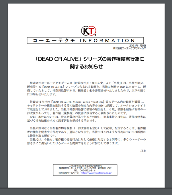 Koei Tecmo ได้ประกาศผ่านเอกสารของทางบริษัทว่า ได้ดำเนินการแจ้งความ และเอาผิดทางกฏหมายกับผู้ต้องสงสัยที่ไม่ระบุชื่อ ซึ่งบุคคลดังกล่าวได้สร้างและขาย DVD ที่ไม่ได้รับอนุญาต ซึ่งได้ดัดแปลงงานภาพ เข้าข่ายละเมิดลิขสิทธิ์จากซีรีส์Dead or Alive ซึ่งผู้ต้องสงสัย ได้มีการบันทึกภาพจากเกมหลายๆเกมที่ลง MOD แบบ18+ รวมถึง Dead or Alive Xtreme: Venus Vacation โดยมุ่งเน้นไปที่การ ถอดเสื้อผ้าของตัวละคร โชว์อวัยวะ สัดส่วนที่ผิดไปจากความตั้งใจของผลงานต้นฉบับ ซึ่งได้มีรวบรวมเป็นDVD ลงขายตามเวปประมูลสินค้าแล้ว