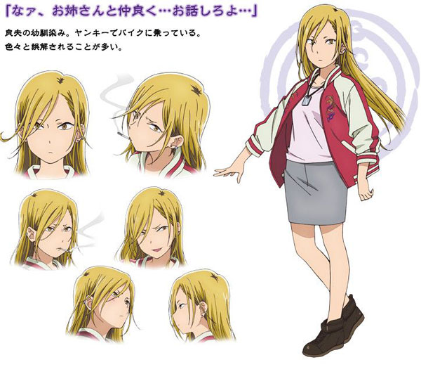 สาวเฮี้ยวประจำหมู่บ้าน เพื่อนสมัยเด็กของโยชิโอะ หน้าตากวนๆ ไม่ค่อยรับแขก แถมชอบใช้ความรุนแรง คำพูดคำจาก็ดูดิบเถื่อน ทั้งที่ความจริงก็ไม่ค่อยมีอะไรเท่าไหร่ เธอเป็นหญิงสาวที่เห็นครั้งแรก มาจิก็กลัวจนถึงกับร้องไห้ บุคลิกโดดเด่นของเธอ นอกจากเสื้อผ้าหน้าผมที่เห็นแล้ว เธอยังสูบบุหรี่ และขับมอร์ไซค์เท่สุดๆ อีกด้วย เริ่มสนิทกับมาจิได้ก็เพราะทึ่งในความหลงไหลรู้ดีเรื่องแฟชั่นของมาจินี่แหละ